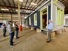 From the airport roof, the group traveled to Corvallis to walk through the world-class research facilities at the TallWood Design Institute (TDI) on the campus of Oregon State University in Corvallis. TDI is a leader in applied mass timber research and an important source of innovations and breakthroughs. The group heard about the research, development, and prototyping efforts needed to bring forth a modular mass timber industry. For example, the prototyping research underway at the University of Oregon aims to find cost-effective solutions to modular mass timber housing and retrofits.