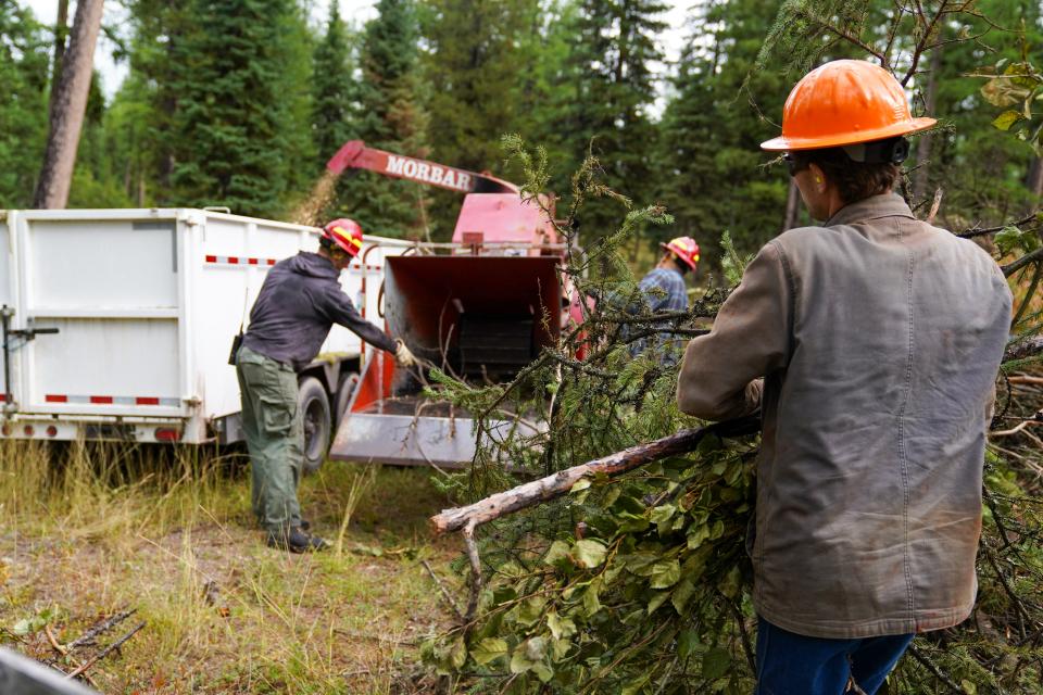 DNRC employees load a chipper with forest debris in the Lindbergh Lake neighborhood in Swan Valley, Montana.